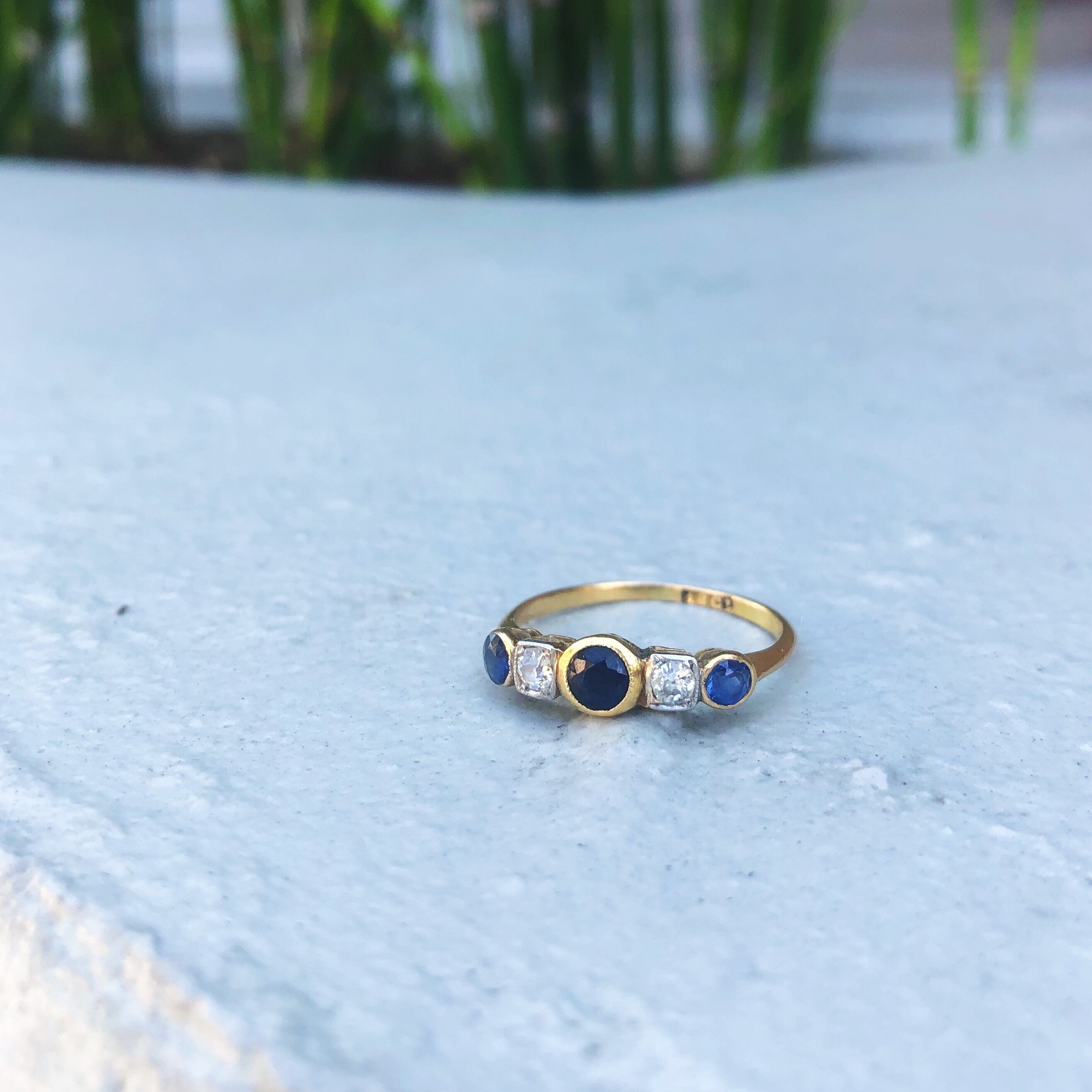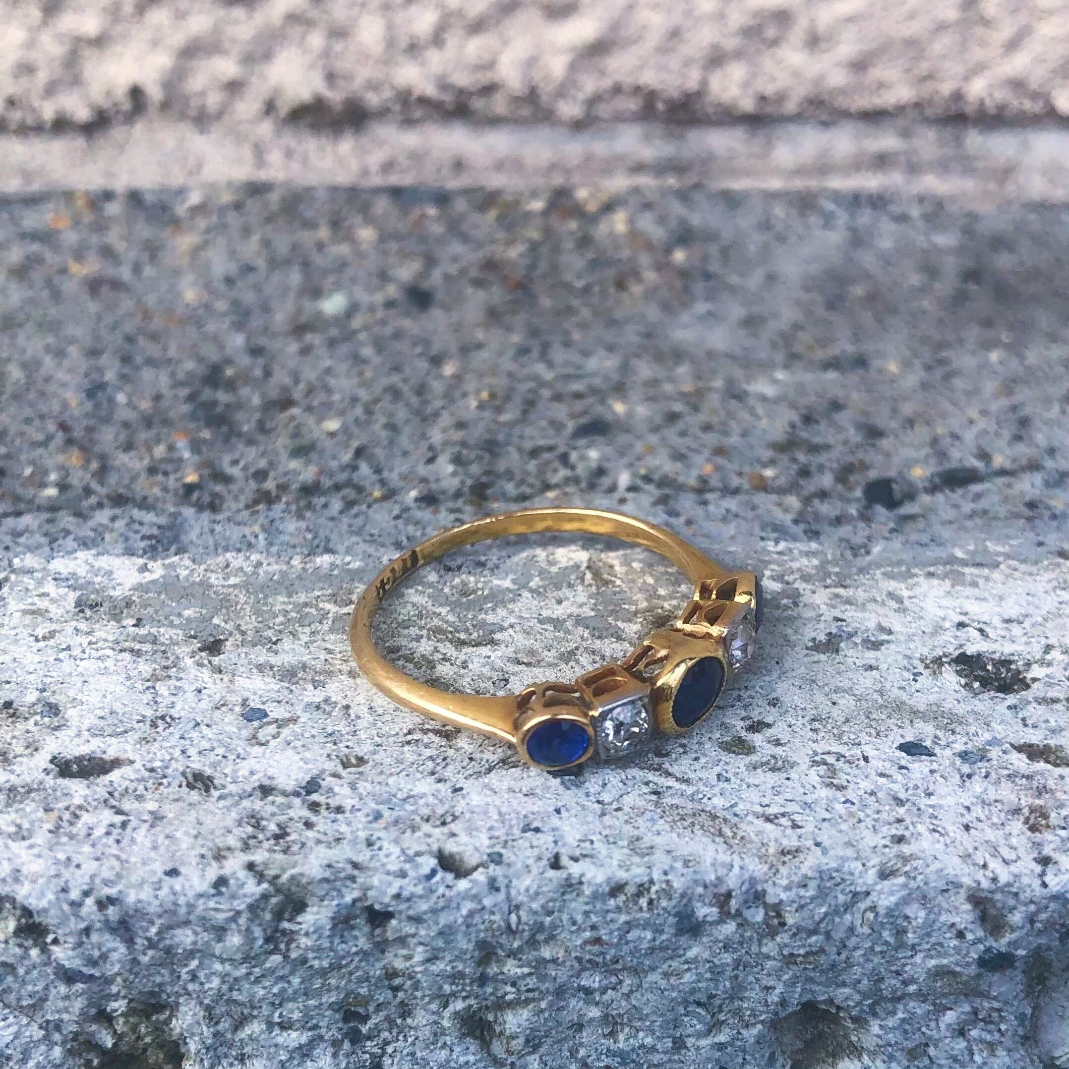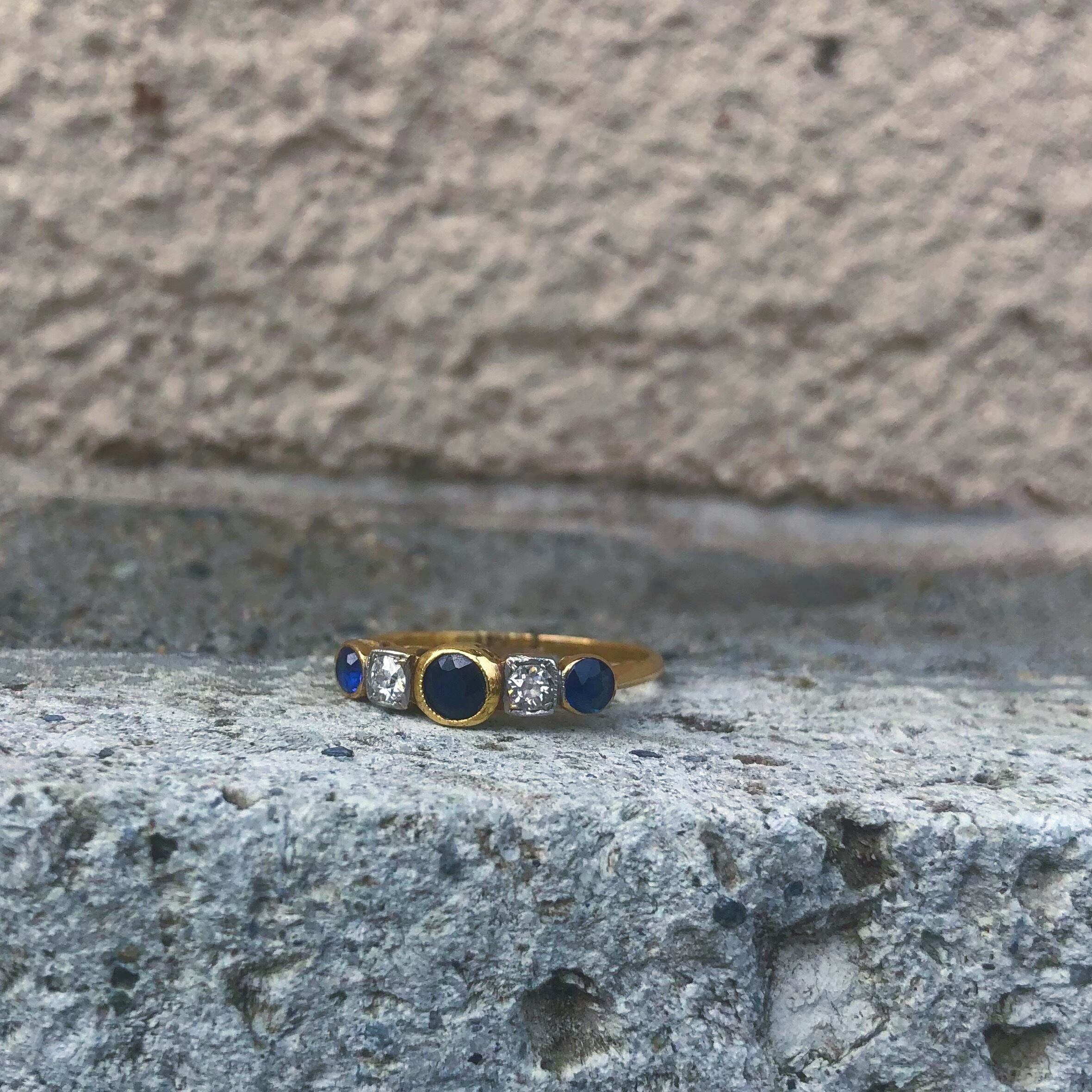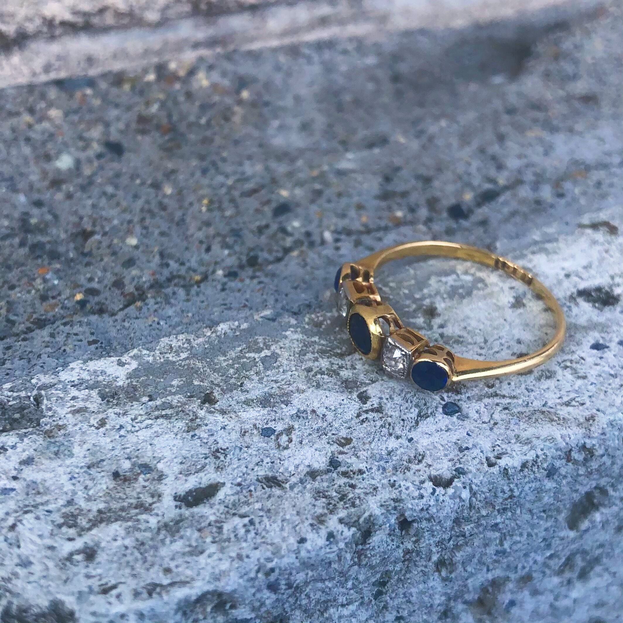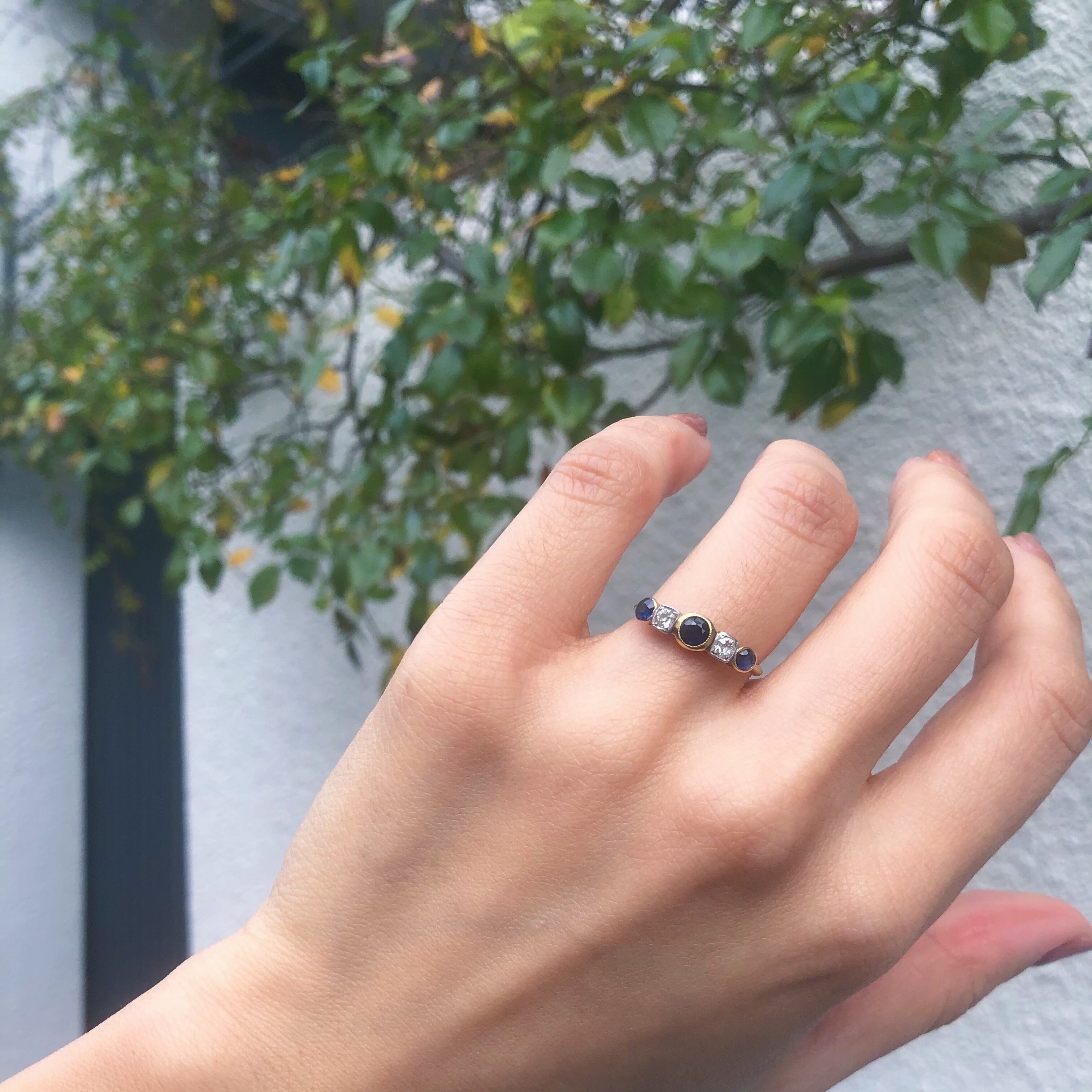 三石の濃く深みのあるブルーサファイアがダイヤモンドと交互に施されており、また余分な部分がなく個々の石が洗練され並べられている印象を受けます。ダイヤモンドはオールドマインカット、ブルーサファイアも綺麗に色濃く輝きます。全体的に細くつけ心地のいいリングです。