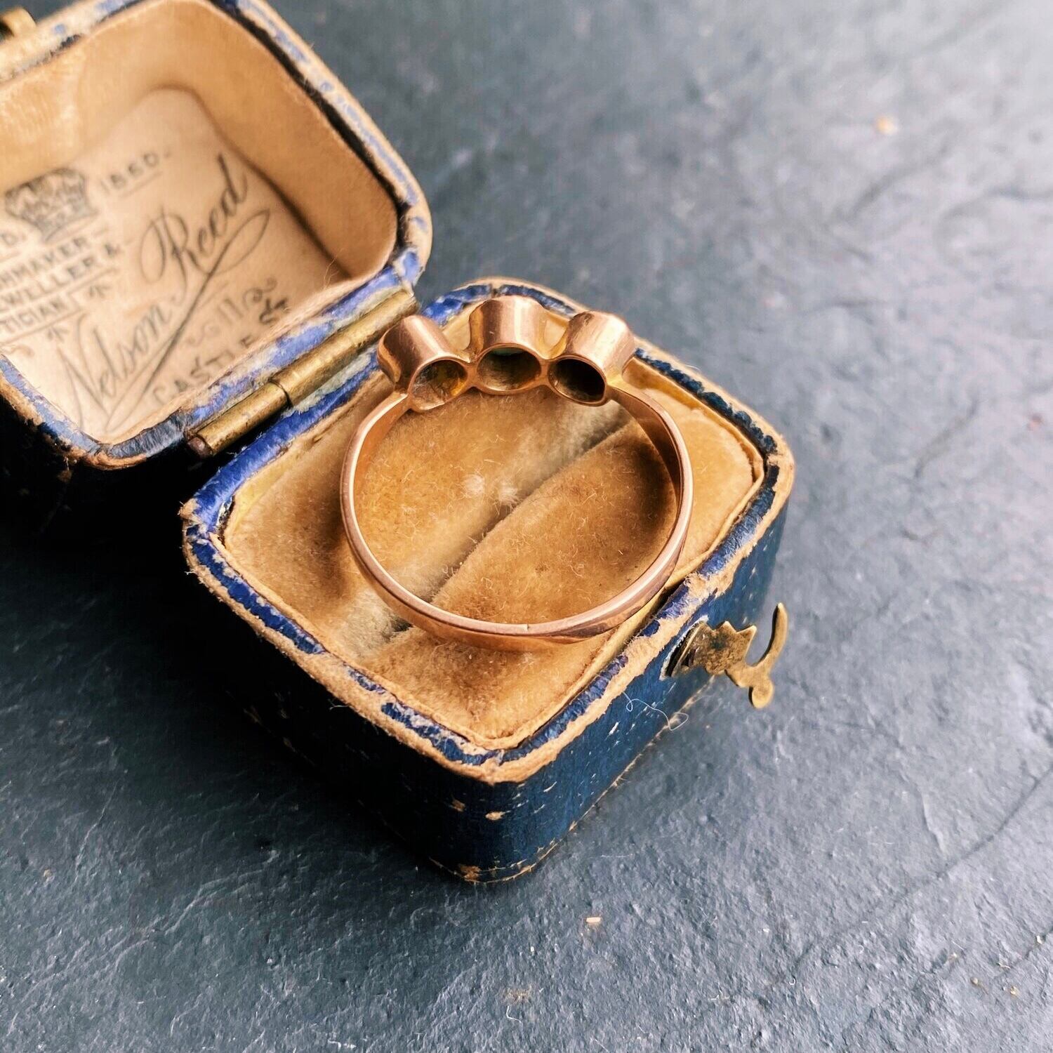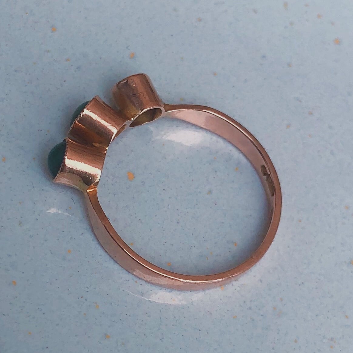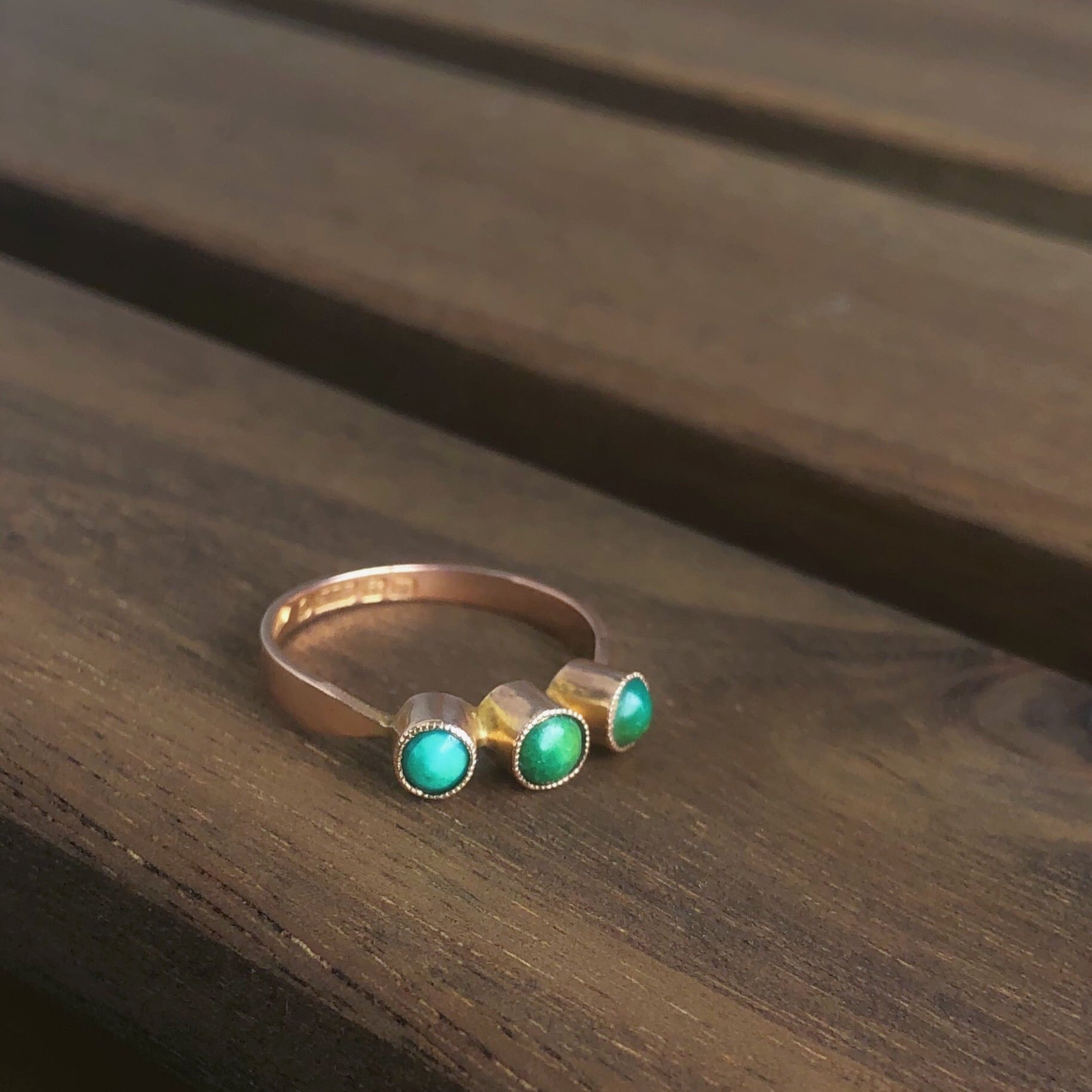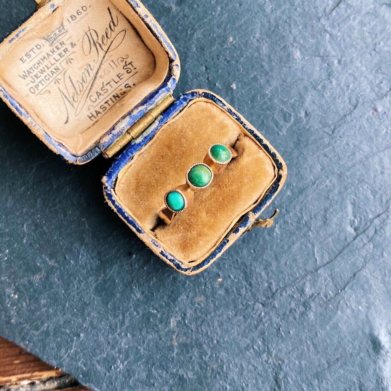 1911年に作られた3石のターコイズが施されたリングです。恐らく同じ色であったであろう三石のターコイズは深いグリーン、ブルーとそれぞれの持つ個性的な色に変わり綺麗に発色しています。立体的に石がセットされていて遊び心のあるユニークなリングです。