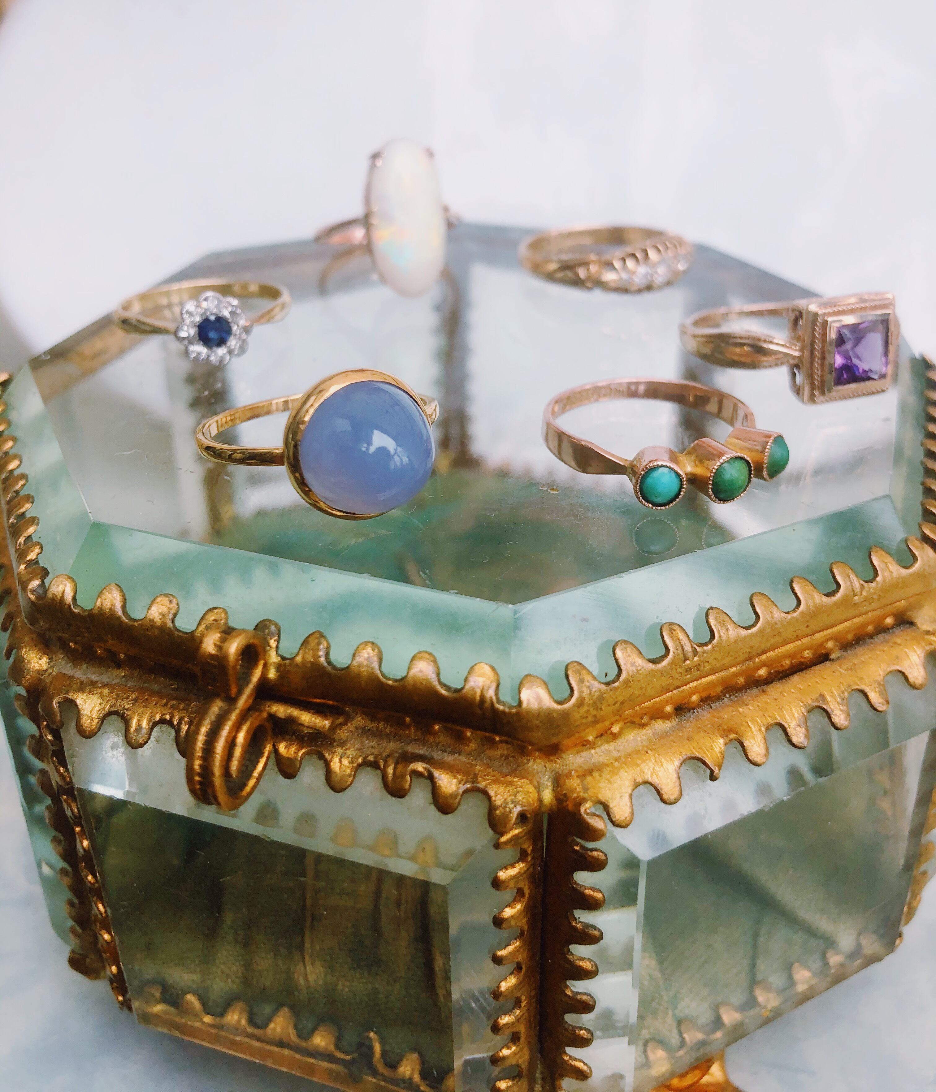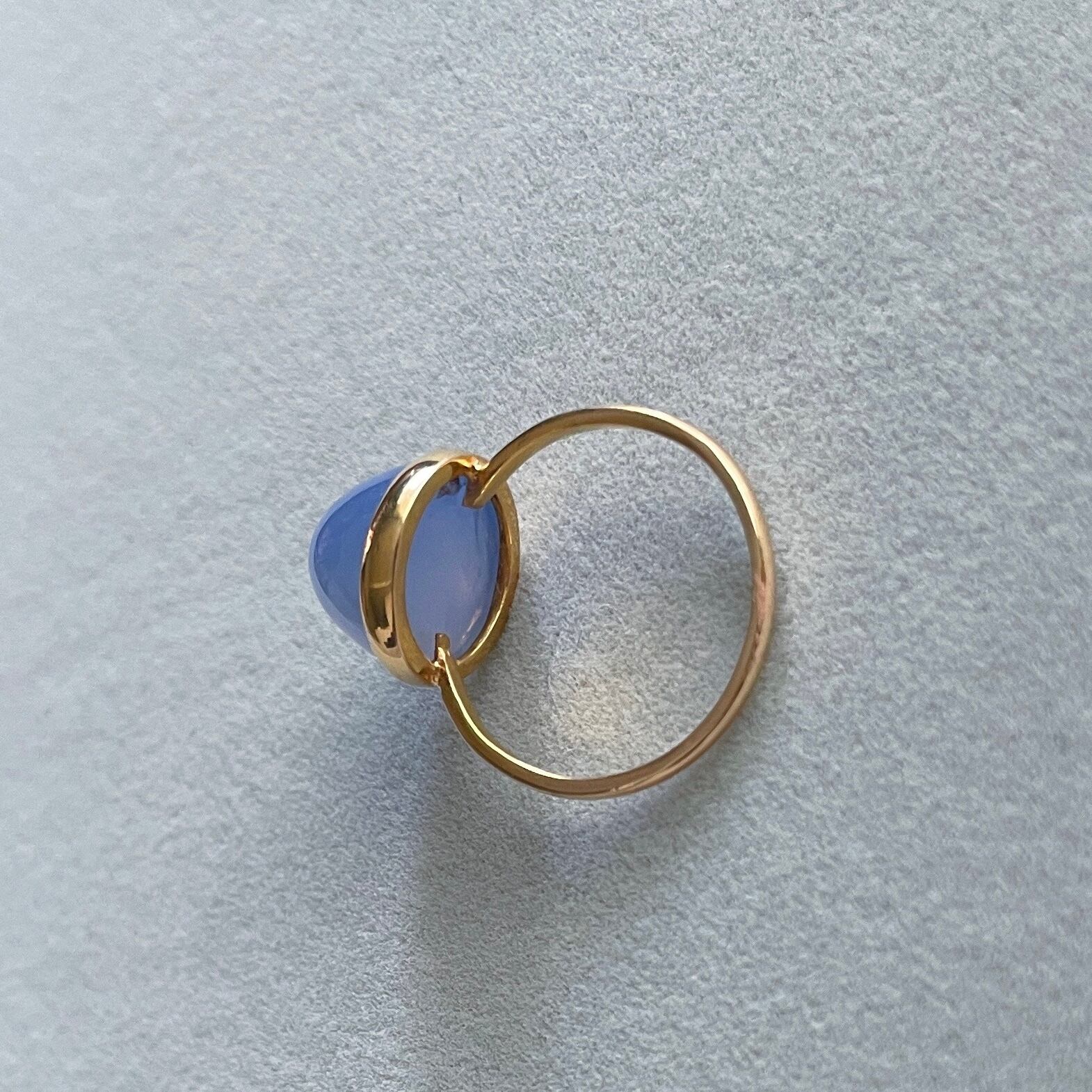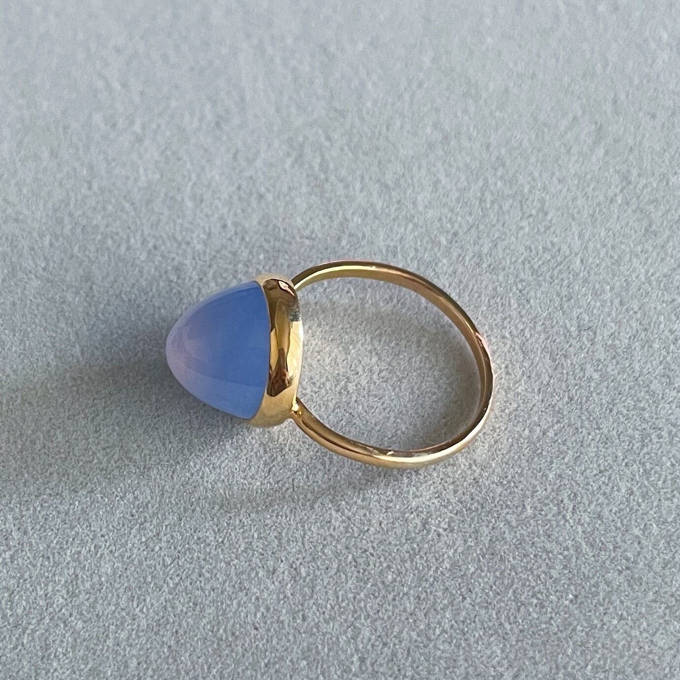 1900年頃のイギリスアンティークリングです。このリングに施されている宝石はカルセドニー。カルセドニー特有の半透明ブルーの優しい色は存在感を放ちます。また精神を癒し心のバランスを整えてくれる石として昔から人々が身につけきました。