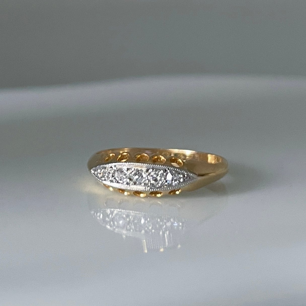 煌びやかに輝くダイヤモンドが横並びに5つ施されており上下挟むように5つのホールがあります。ホールからは光を取込みダイヤモンドを更に綺麗に輝かせます。