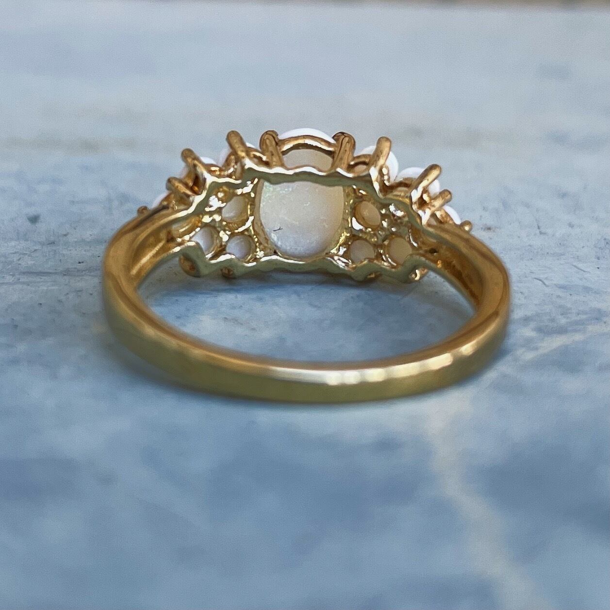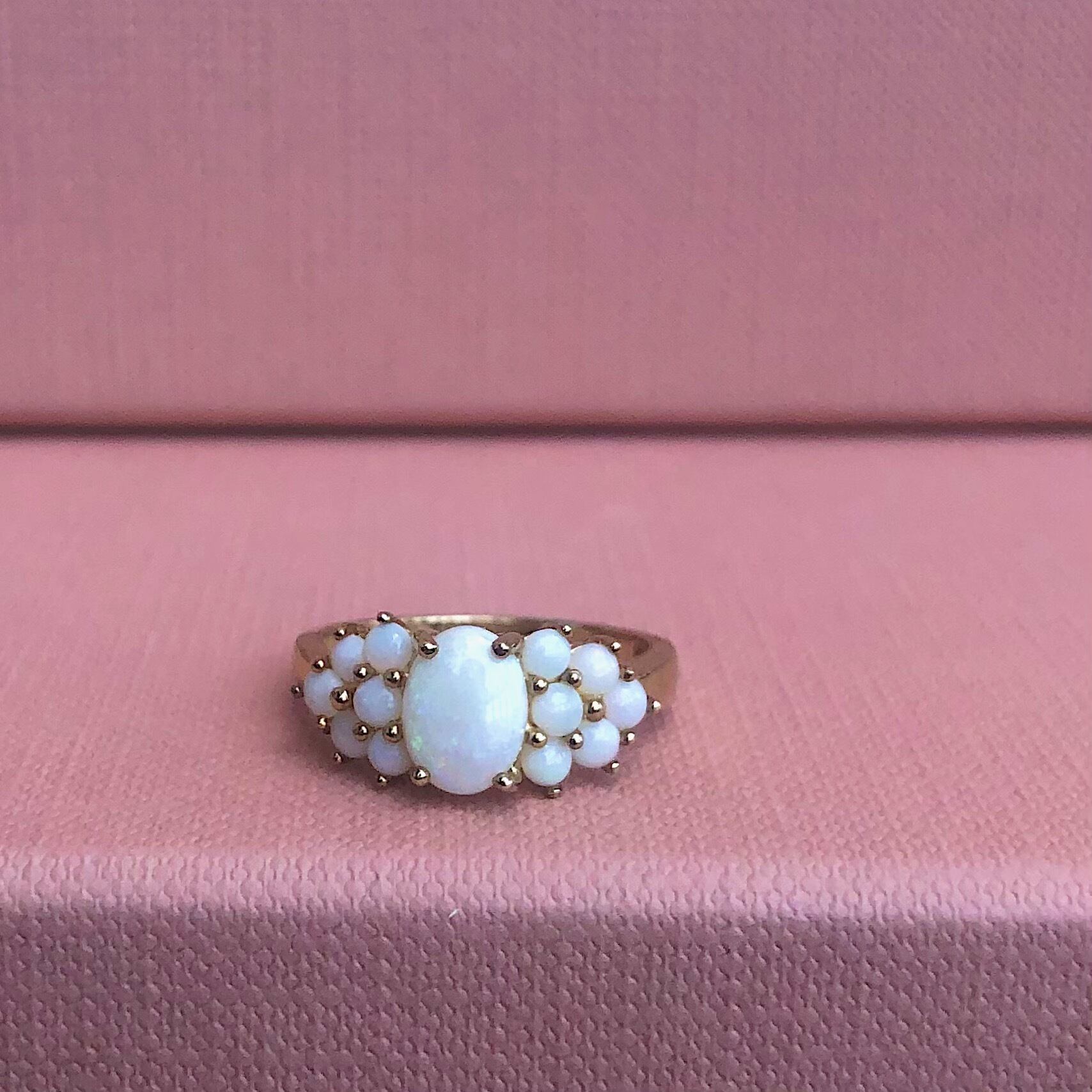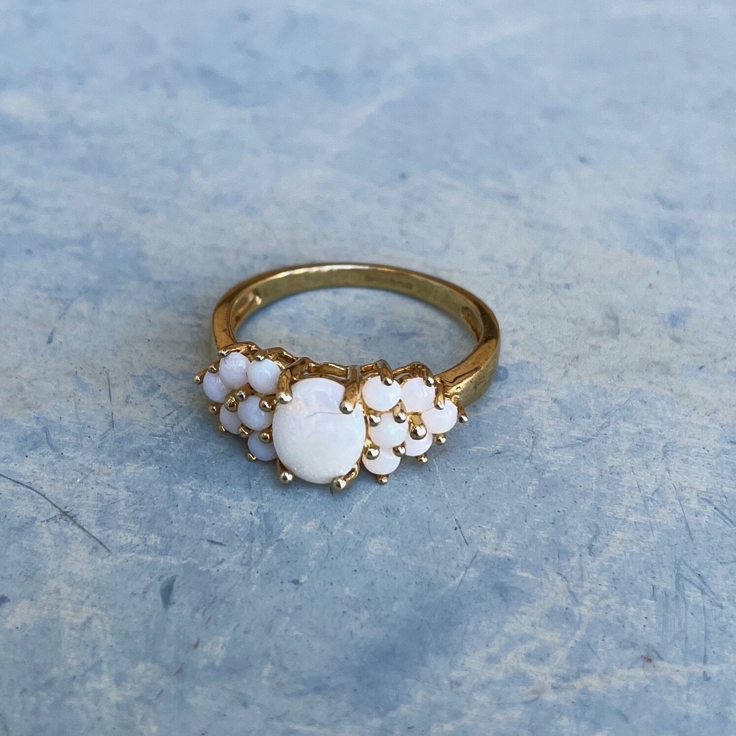 1920年頃にイギリスで製造されたオパールクラスターリングです。クラスターリングの中でもオパールの並びが珍しくあまり見ないデザインで存在感を放ちます。地金は9金。サイズ変更可能なリングです。
