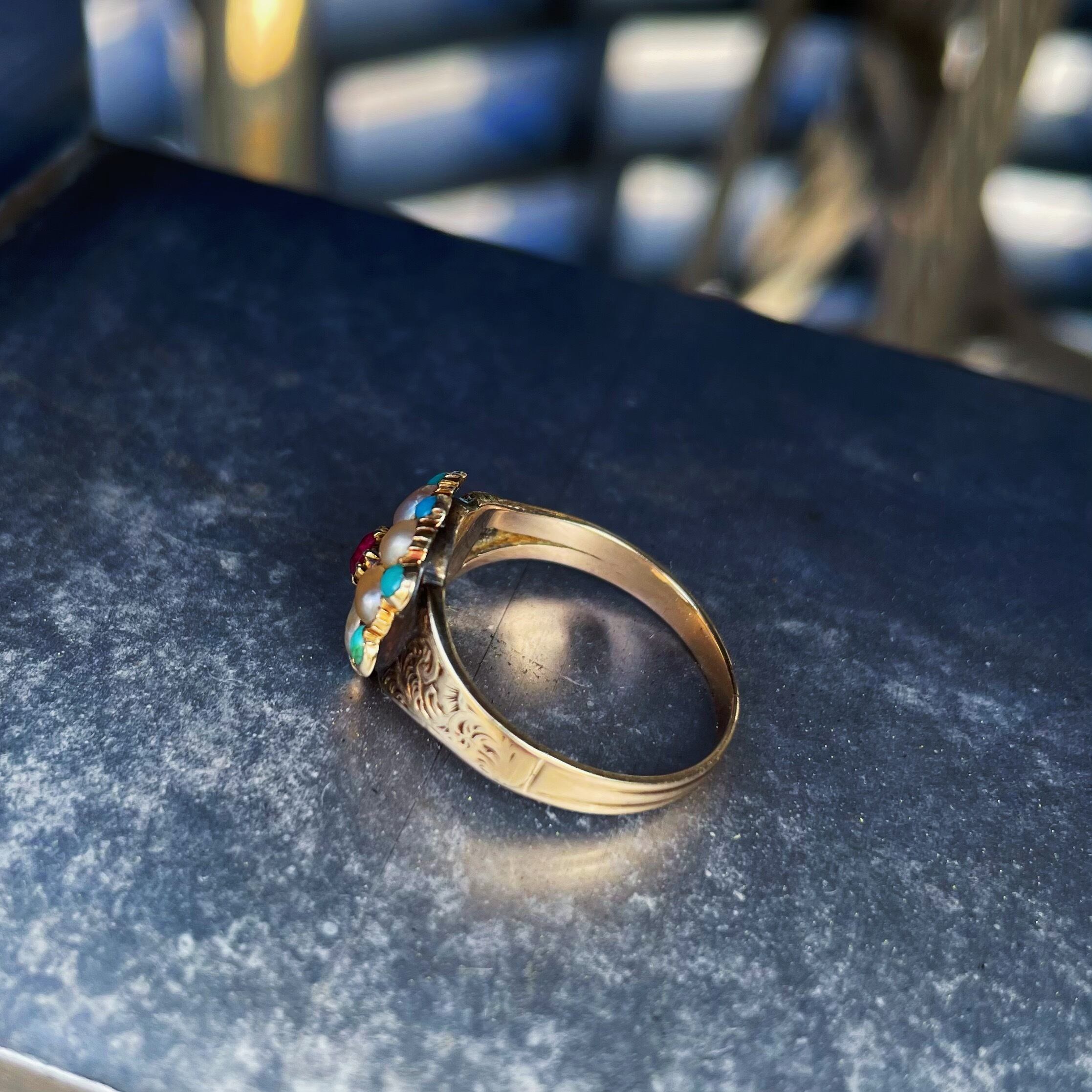 約1880年頃にイギリスで造られたフラワーリング。(リングはリメイクの為、モチーフのみの年号となります。)