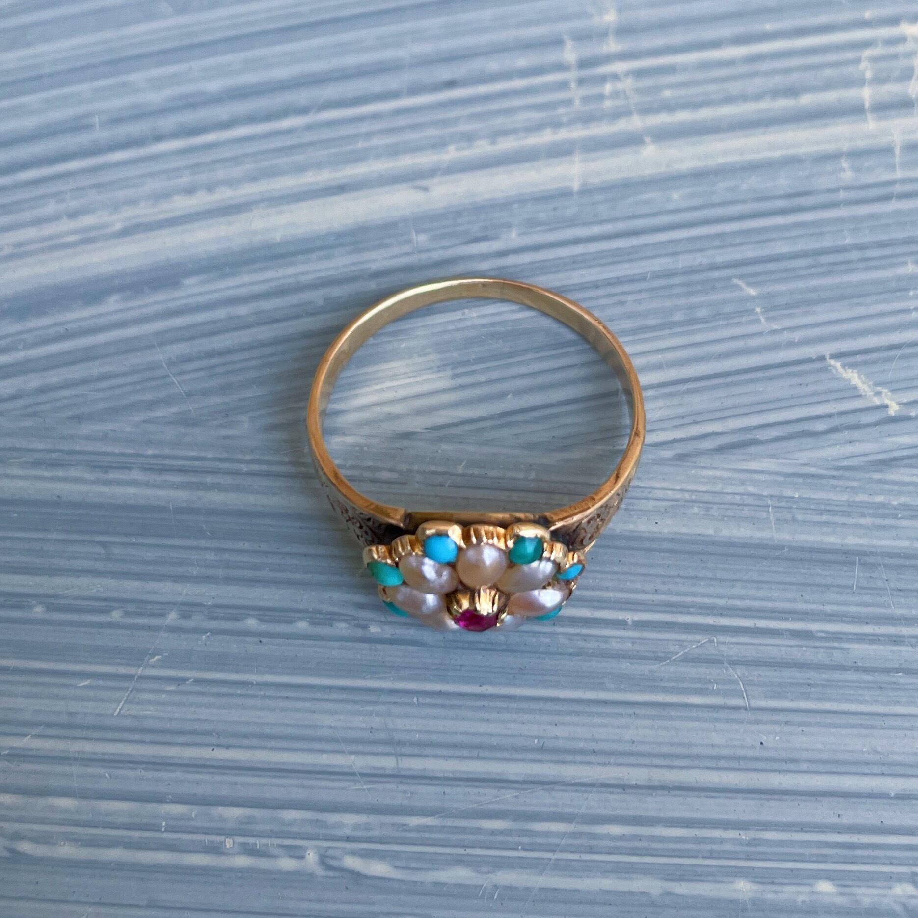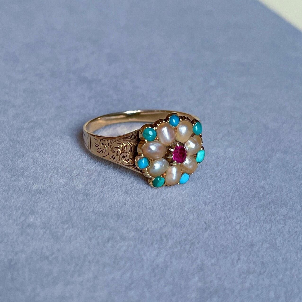 真ん中にはアメジスト、その周りにパールとターコイズが施されたアンティークリングです。色合いも素敵で見ているだけで癒されます。サイド部分には模様が彫られており存在感が一層引き立てられます。手元の印象を華やかにしてくれて日常のアクセントとしても、普段使いにもお使いいただけます。