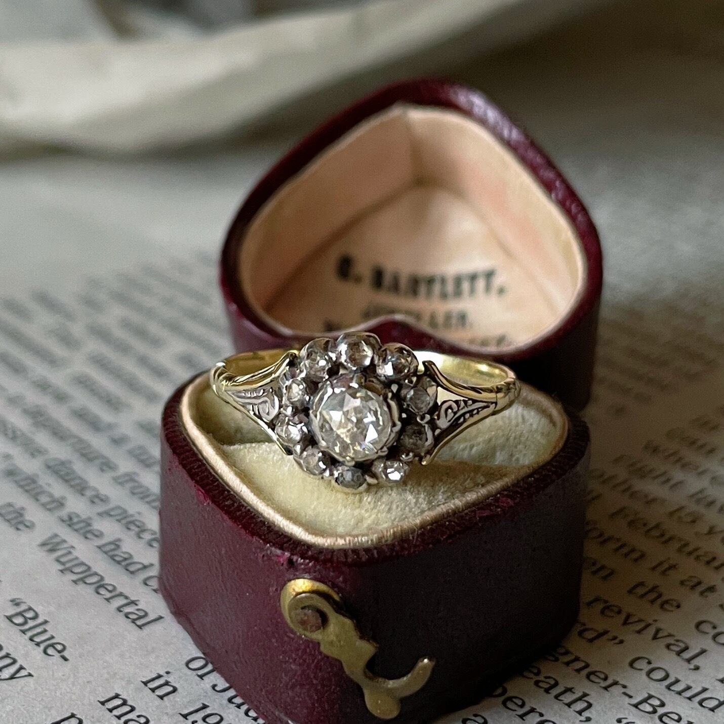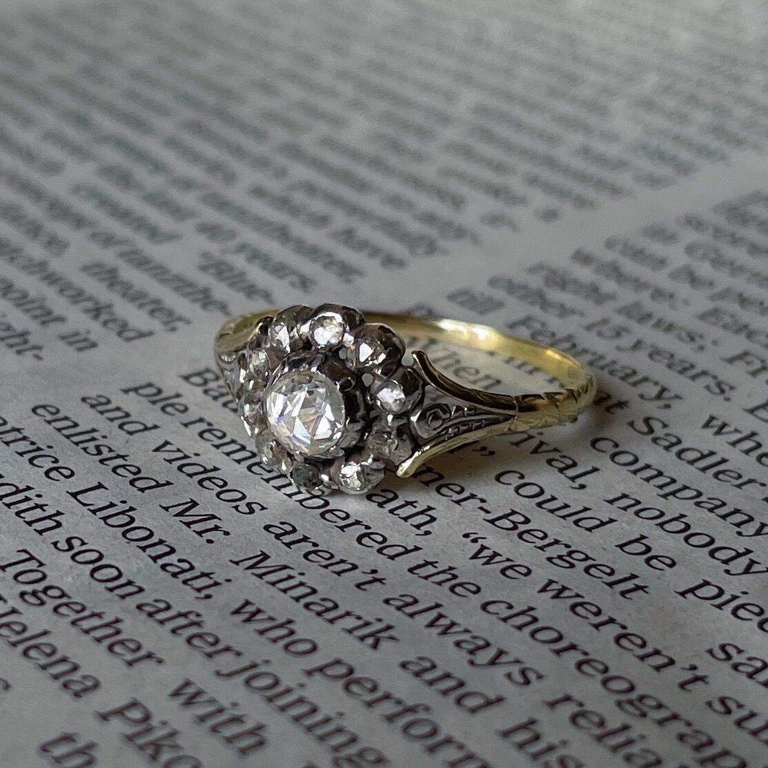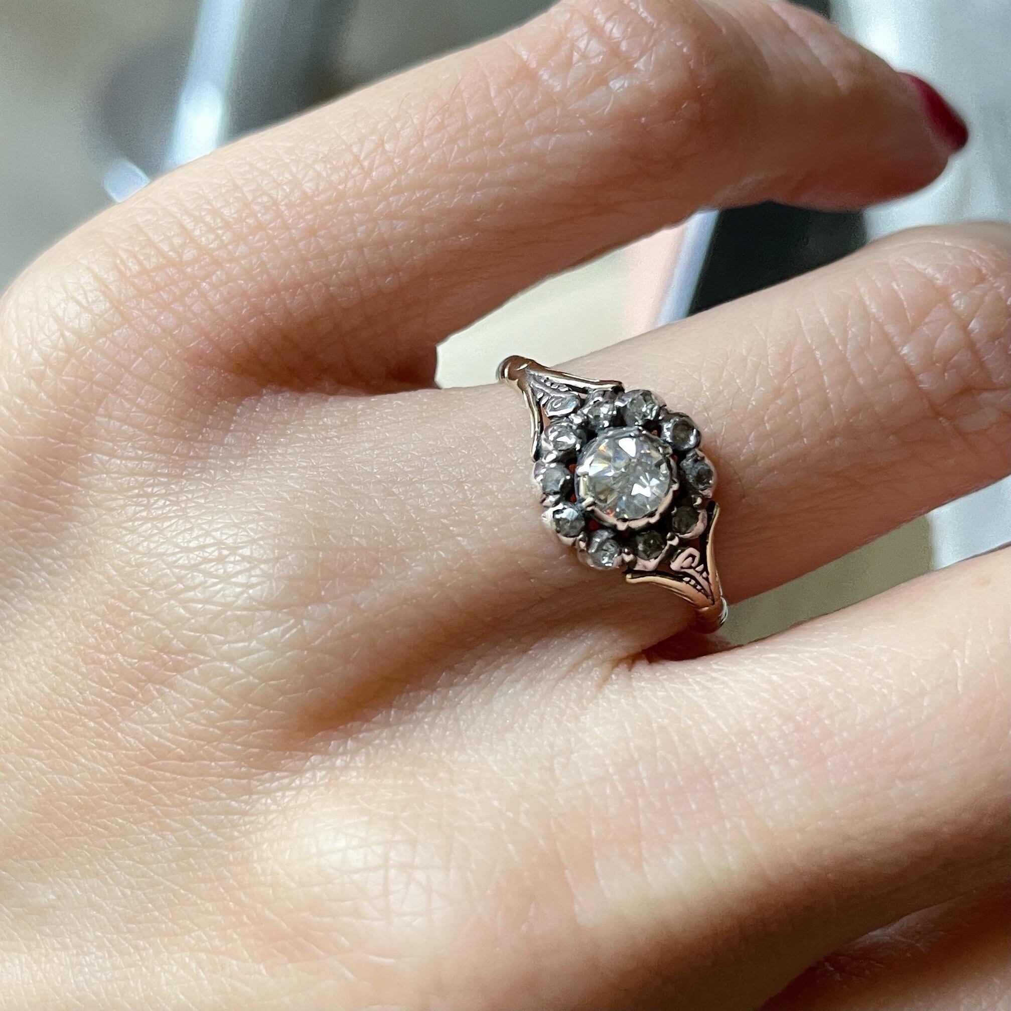 約200年前のジョージアン期のイギリスアンティークリングです。大ぶりローズカットダイヤモンドが真ん中にセットされており、その周りに花びらのように10石の小さなダイヤモンドがクラスター状に囲います。このジョージアン期の伝統的なデザインは直径約1cmあり贅沢にダイヤモンドが施されています。細く繊細なリング部分はイエローゴールド、ダイヤモンドはシルバーと組み合わされています。