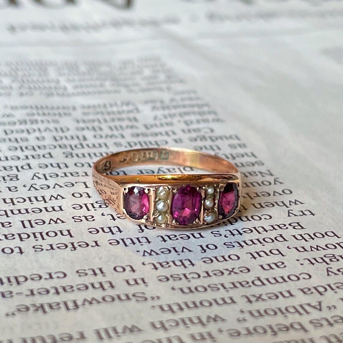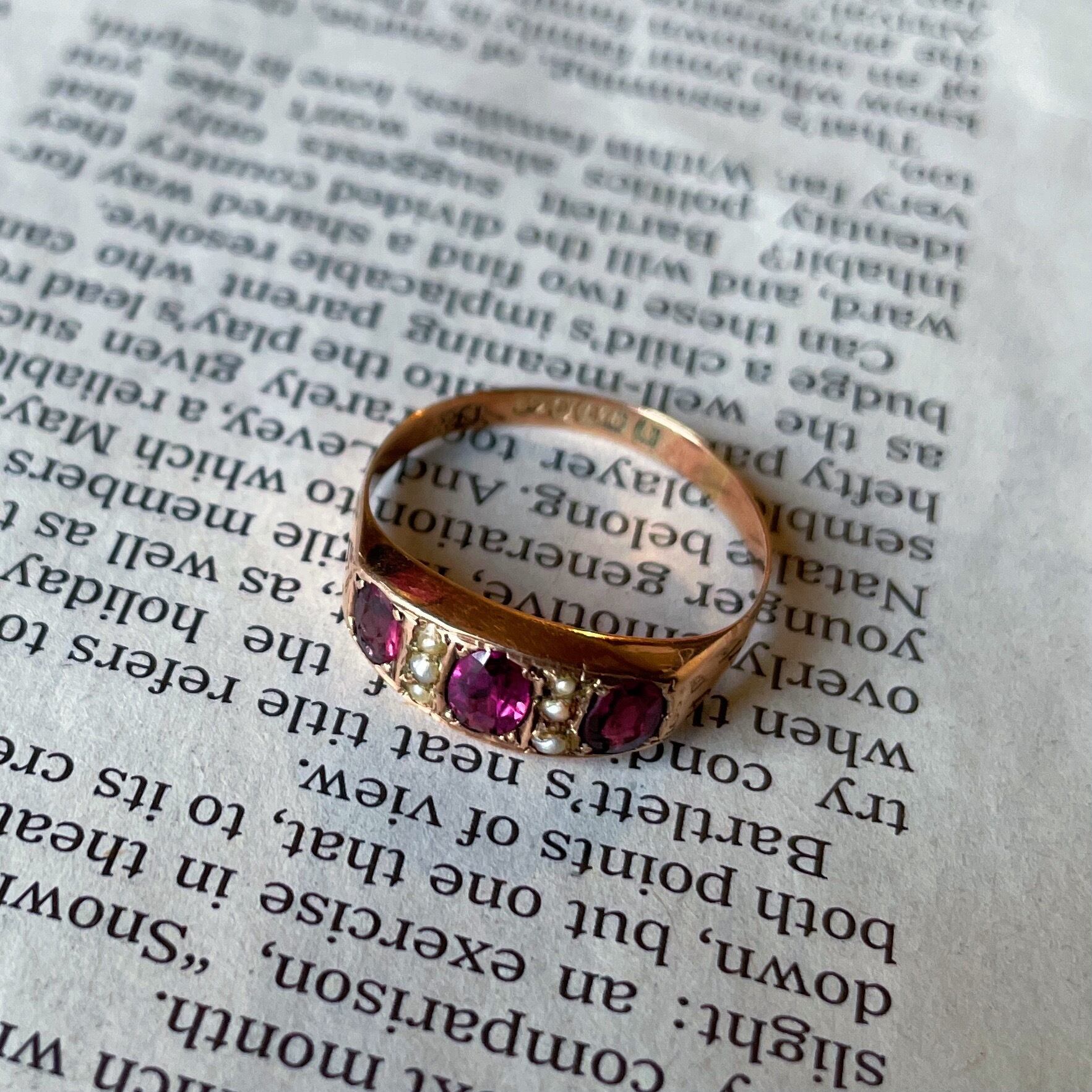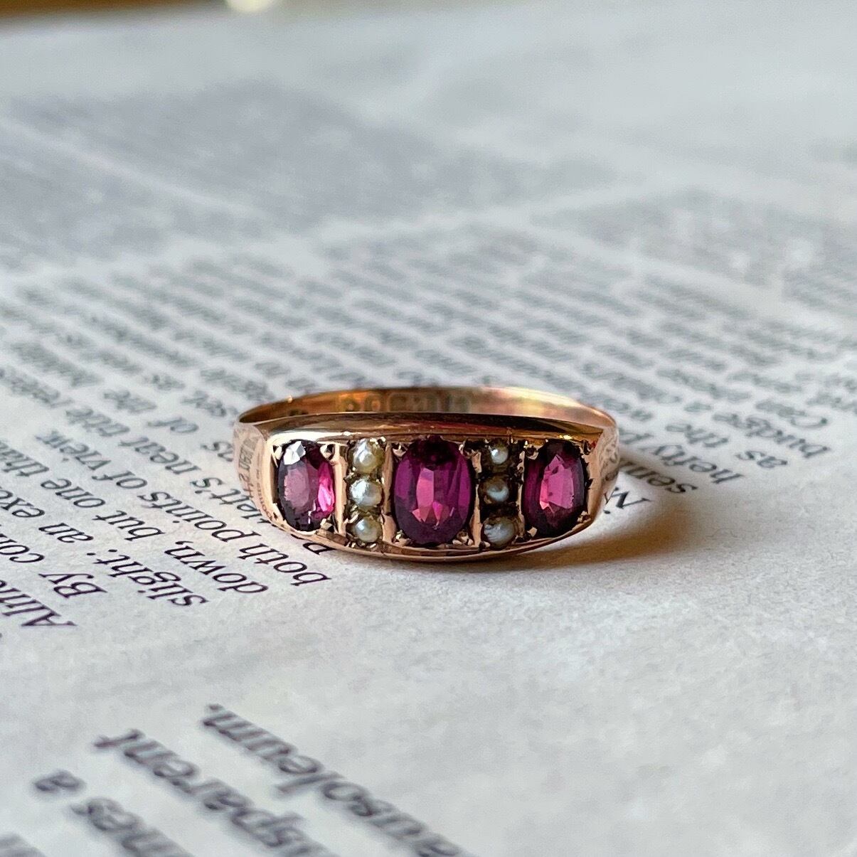 約140年の歳月を経たとは思えないほどルビーのコンディションが抜群です。このリングに施されたルビー特有のパープルピンクが色濃く透き通るような美しさが今もなお演出されます。ルビーの間隔には小さなシードパールが3石づつ施されています。地金は9金とても肌馴染みの良いローズゴールドです。
