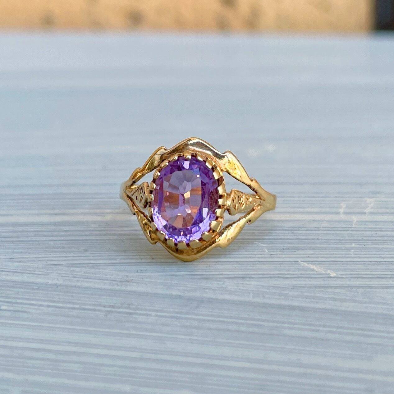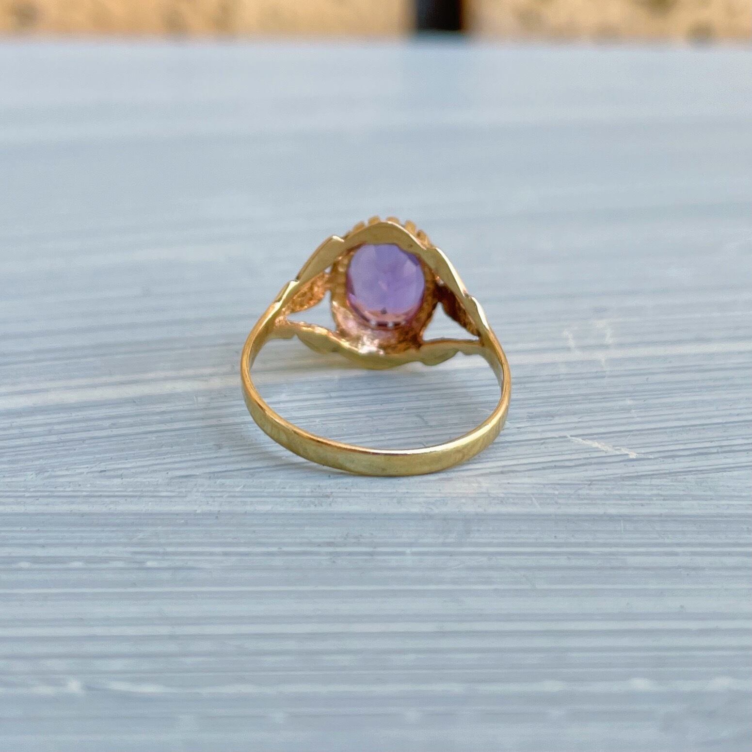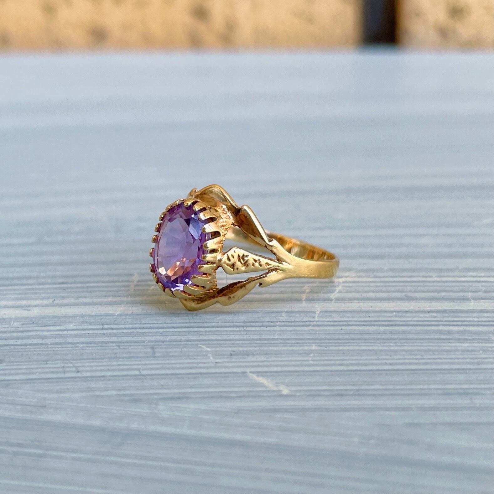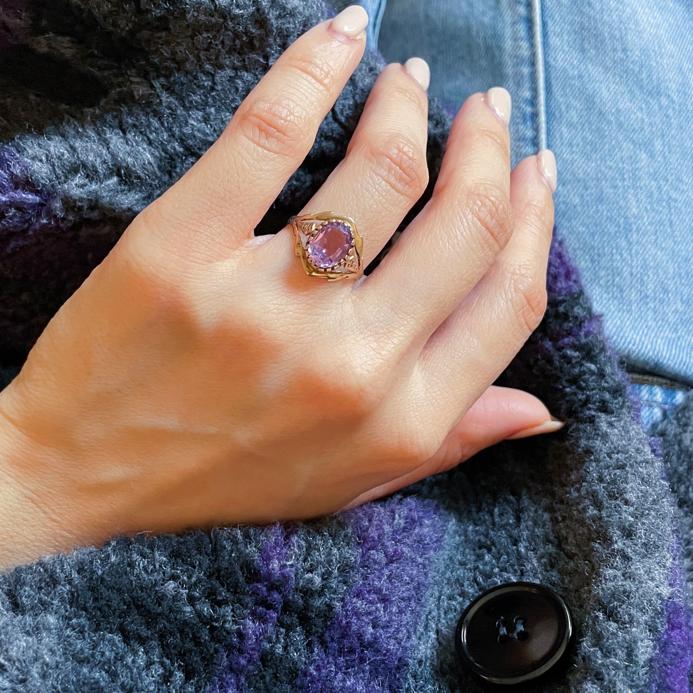 1940年頃のイギリスアンティークアメジストリングです。このリングに施されるアメジストの直径は約10mm幅は約8mm、フレーム部分を入れると直径約14mmになる大ぶりリングです。デザイン性の高いこの立体的な造りは光も入りやすくキラキラと輝き存在感を放ちます。地金は9金です。