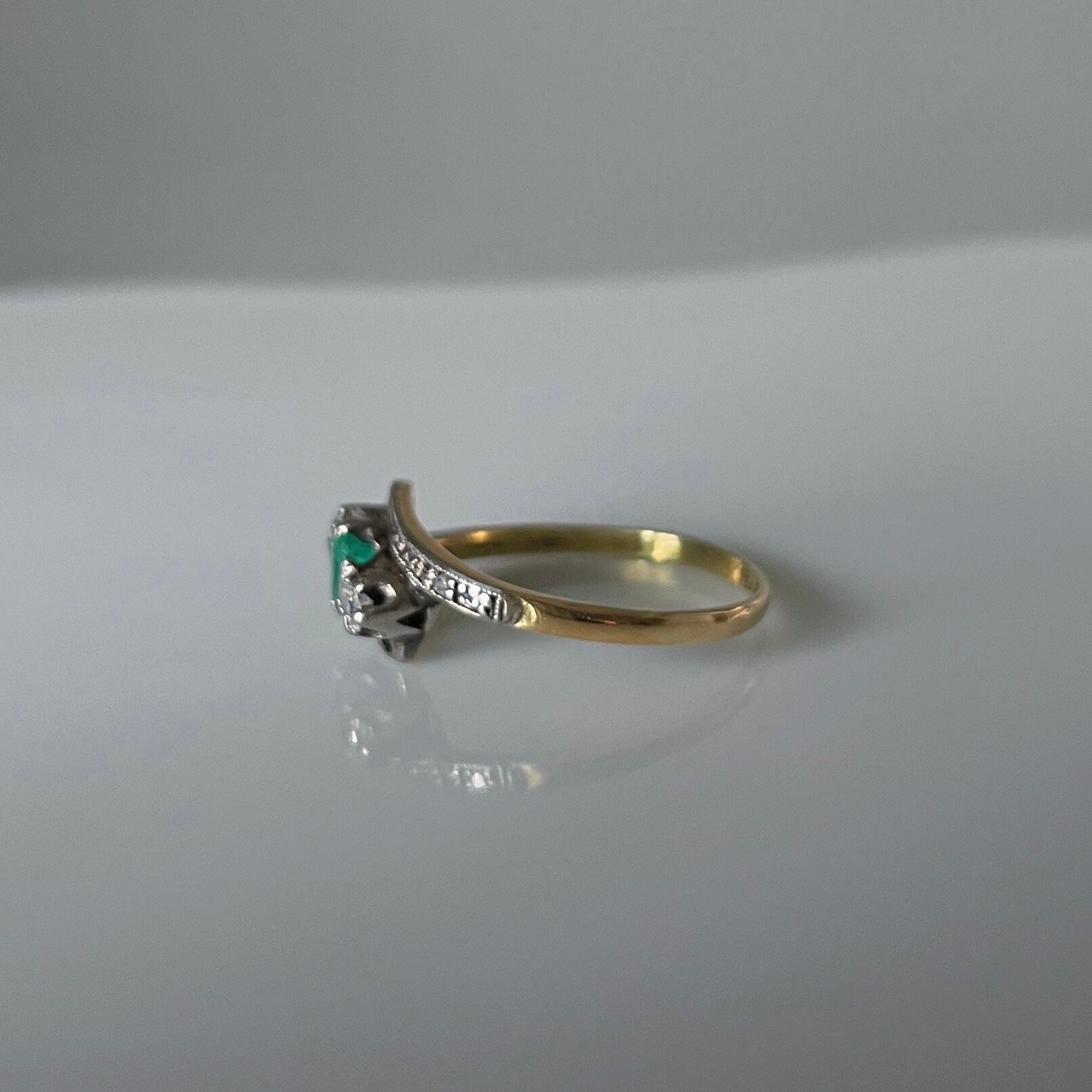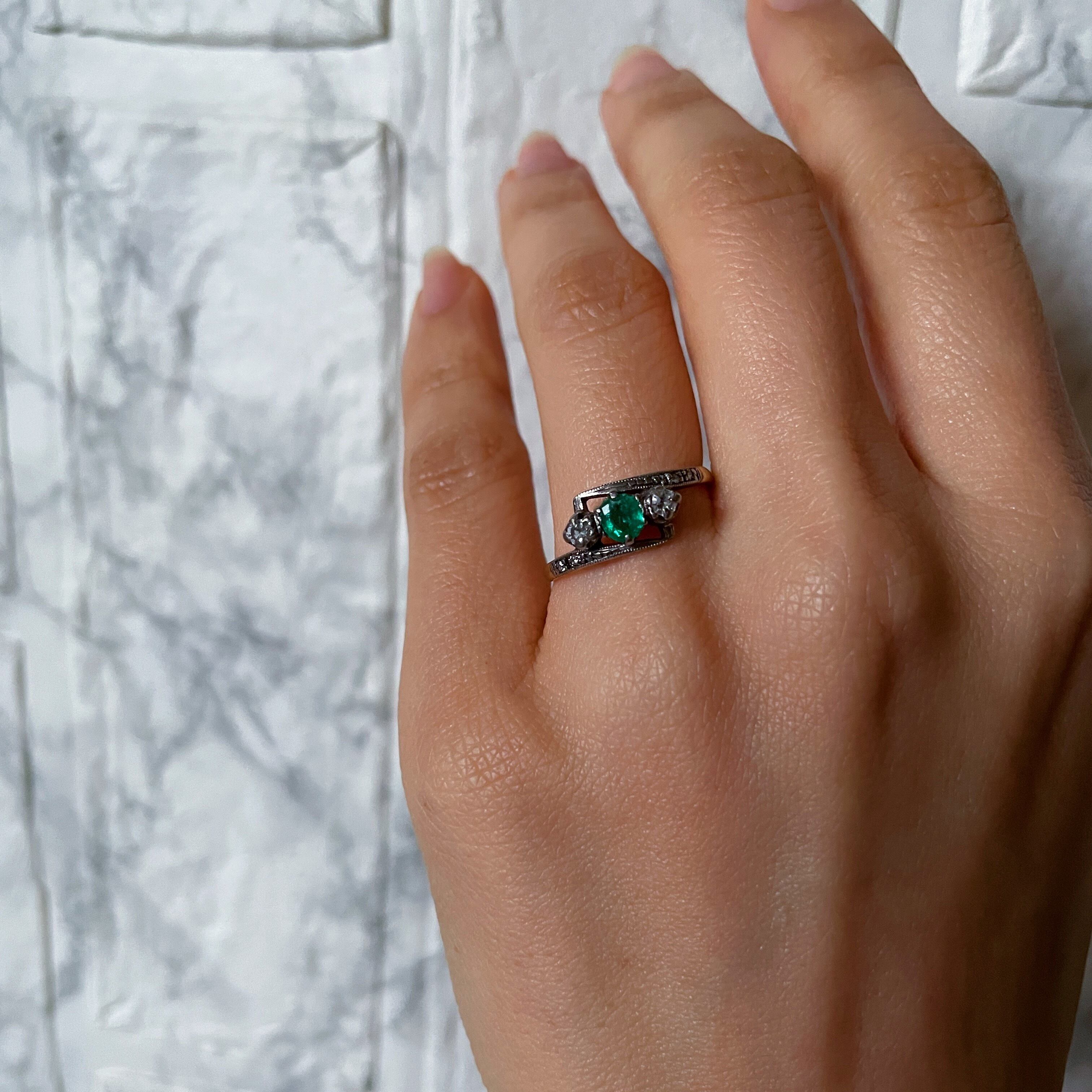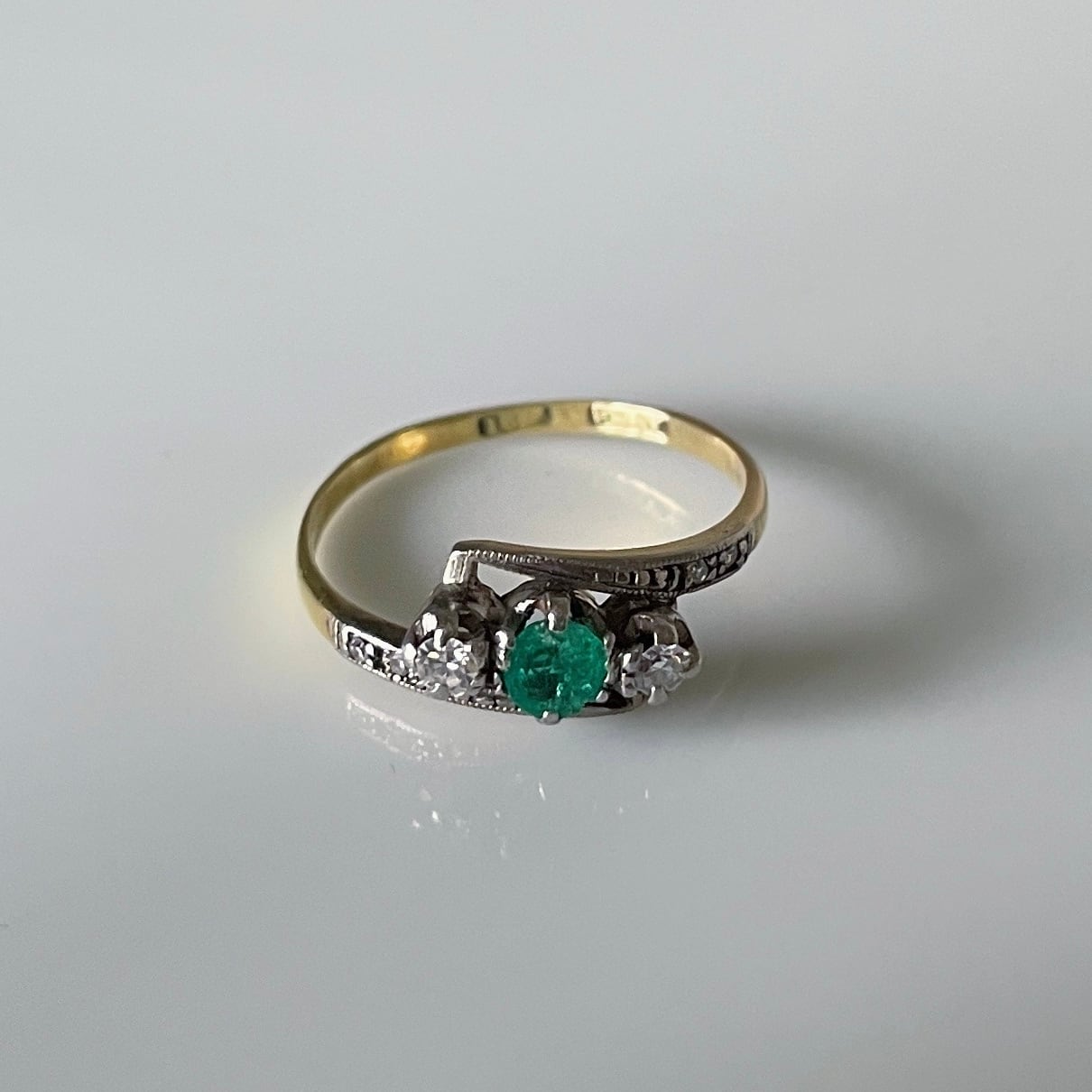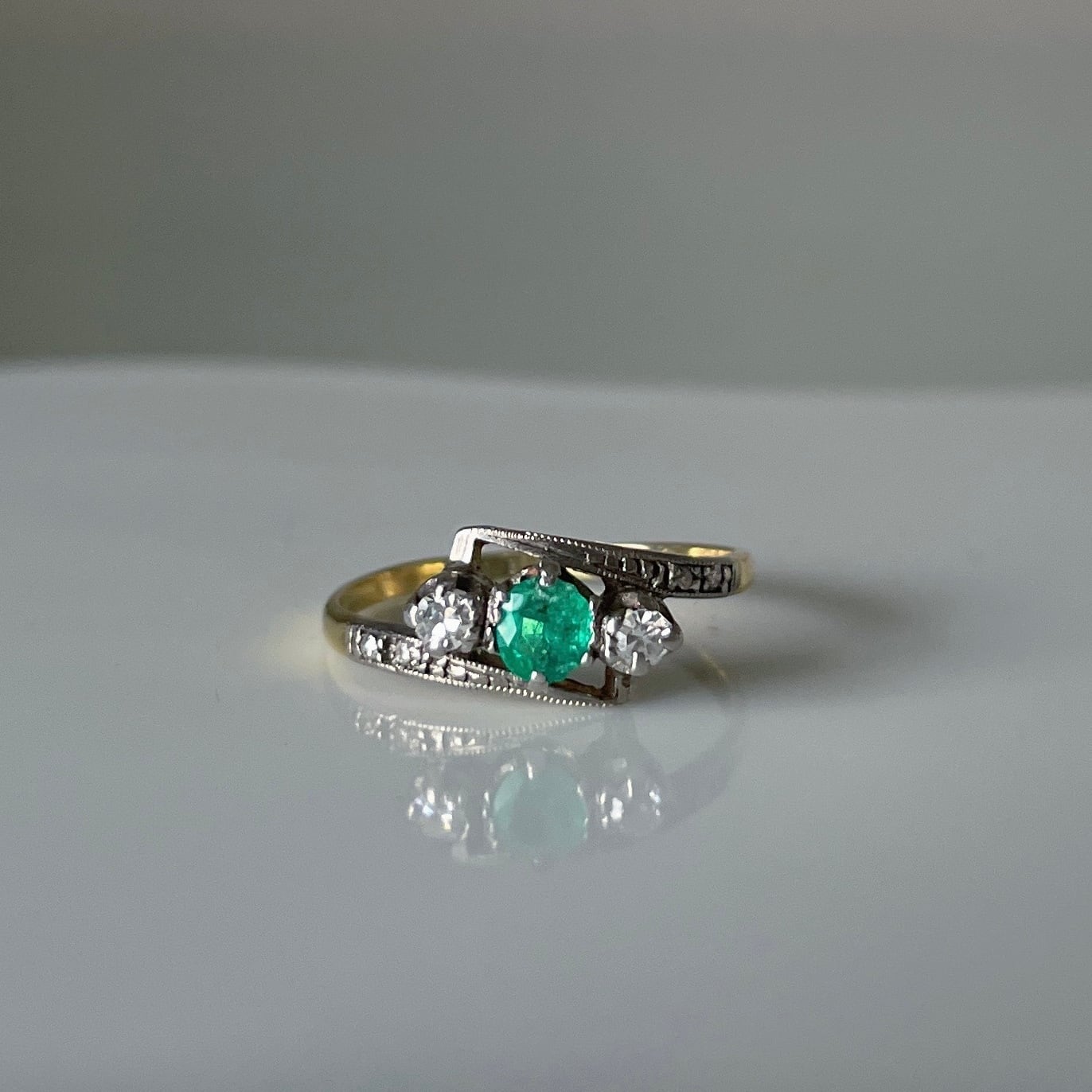 中央の宝石は天然エメラルド、両サイドには煌びやかに輝くダイヤモンドが施されています。