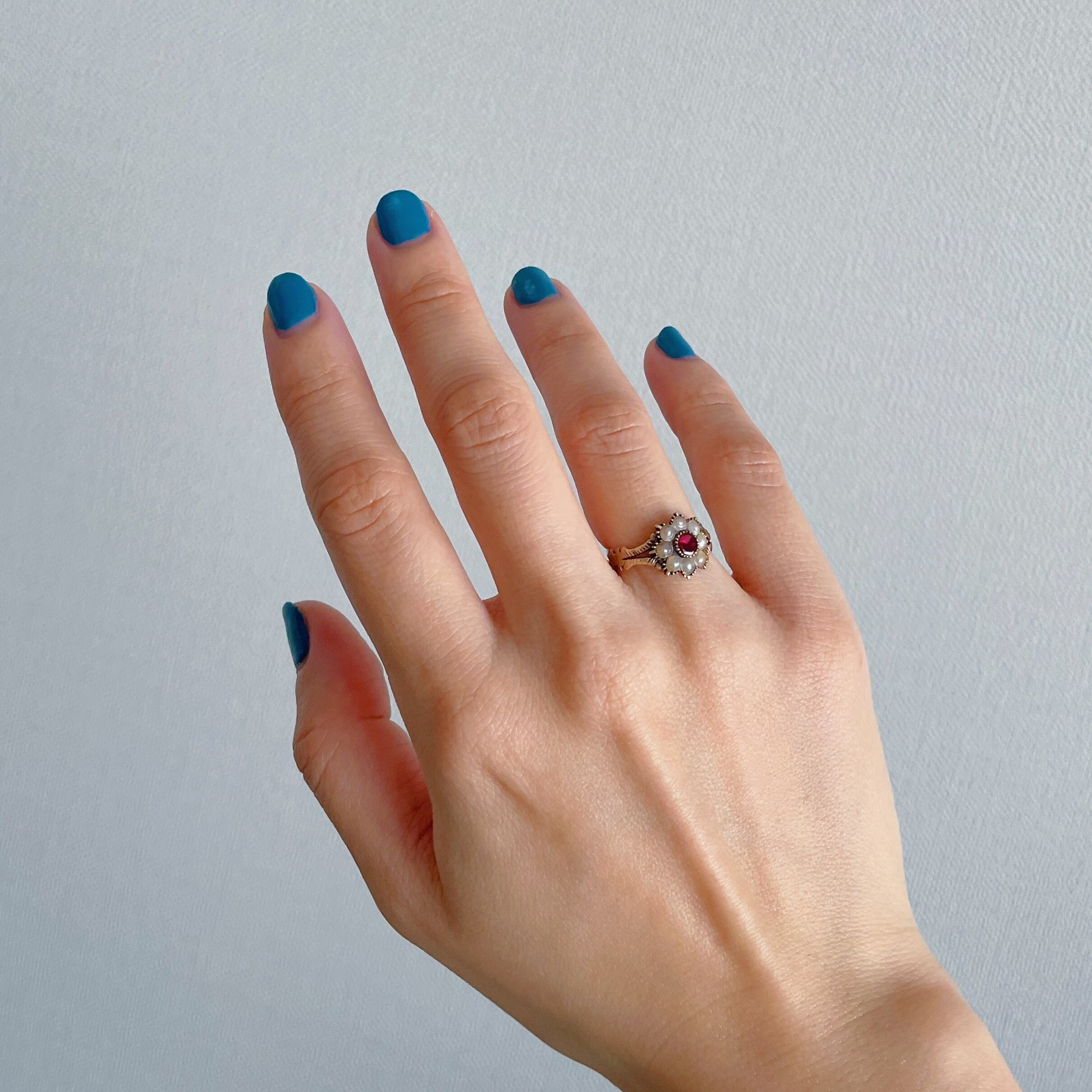 中央に施されているメラメラと輝くと大粒ペーストは自然石と異なり柔らかく扱いやすいのが特徴的。ペーストは1730年にフランスの宝石商ジョルジュ・フレデリック・ストラス(Georges Frédéric Strass) によって製作され、1734年には王ルイ15世王室御用達の宝石細工師に指名され、またたくまに世界中でペーストジュエリー市場を広げます